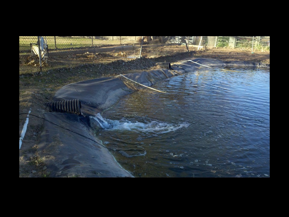 I dug a pond off of my irrigation trench in the back of the property. Knowing that local irrigation water quality was very poor, I wanted to collect enough water and treat it before I released it to the buried culvert tanks.